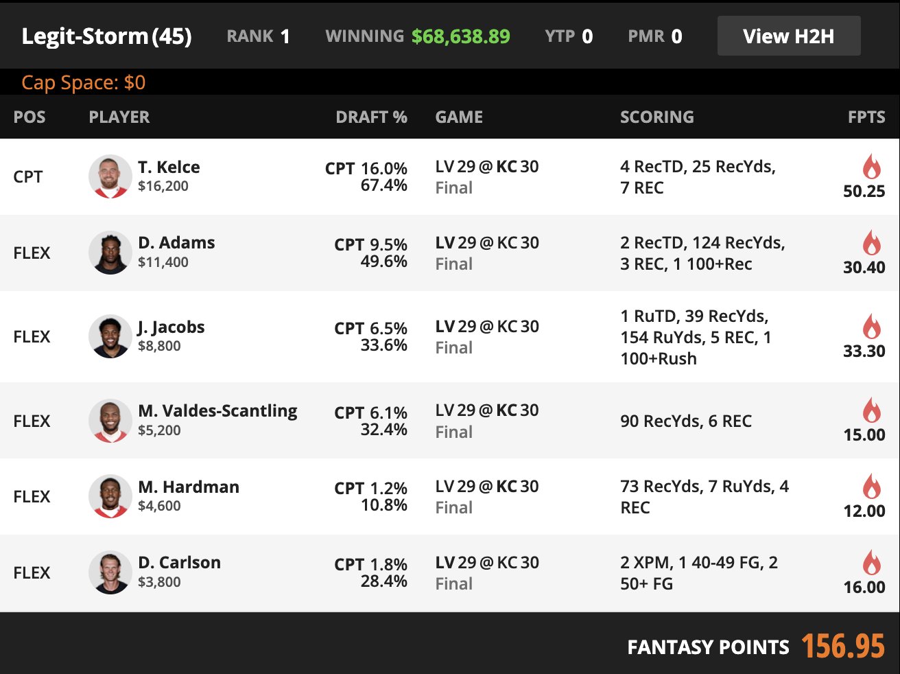 What happened in the game supports the logic. Kelce monopolized touchdown equity. Adams still hit for two scores and the 100 yard bonus. Jacobs put up a dominant rushing and receiving line. Carlson added sixteen points through field goals and extra points. The lineup captured both teams' scoring concentration while refusing to spend salary on the quarterback the field expected to be mandatory.