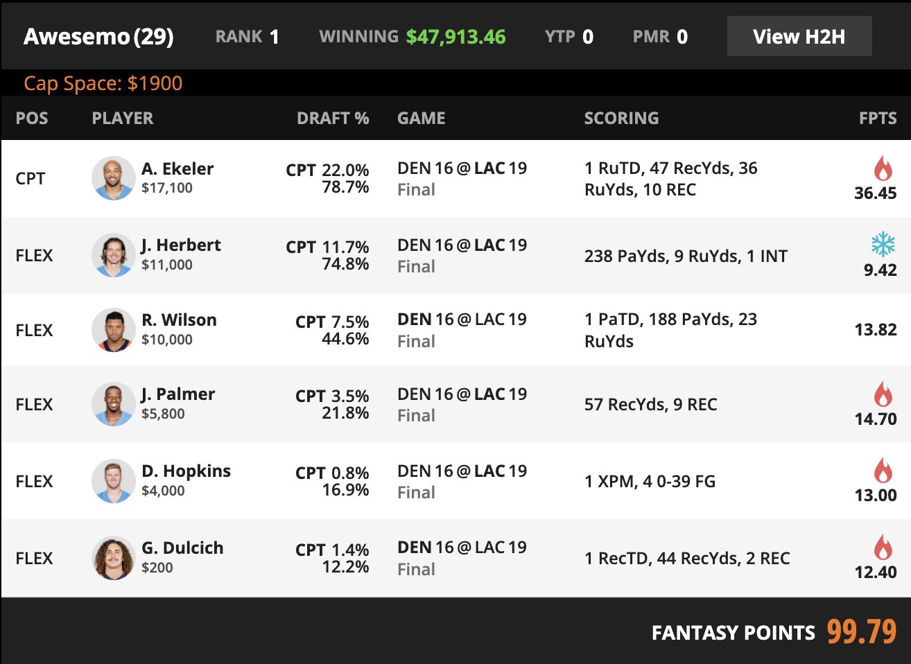 The sharper layer came from the acceptance of bad offense as usable structure. Dustin Hopkins gave the lineup stalled drive scoring from the Chargers side. Greg Dulcich at 12.2 percent ownership gave the roster a near minimum salary Denver touchdown without forcing a dead punt. Russell Wilson was not good, though he was good enough to stay relevant because this slate did not require explosive quarterback scores. Joshua Palmer rounded out the build by catching short area volume in a game where the Chargers receiving tree was thinned out and Herbert spread empty calories toward one of the few available pass catchers.