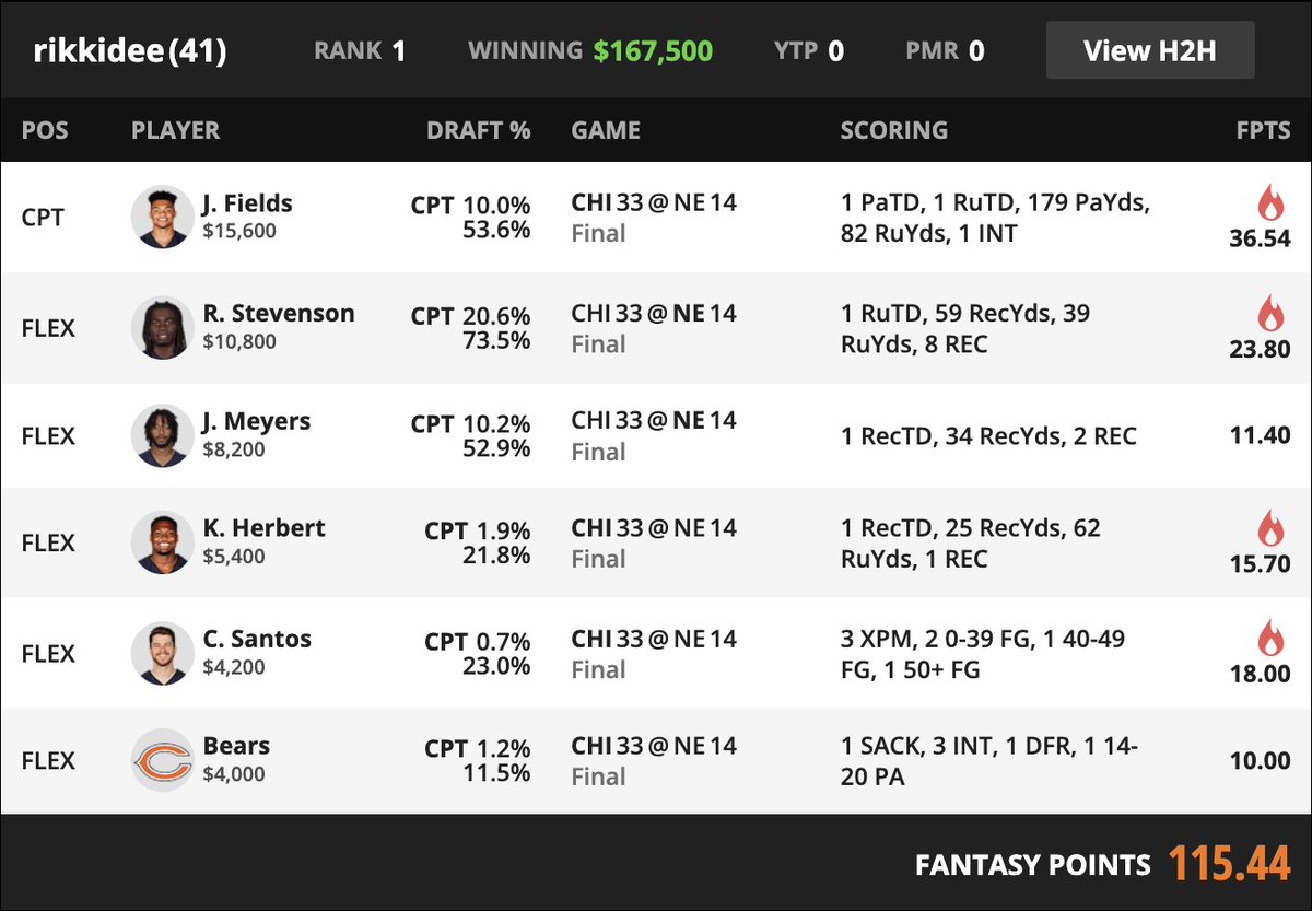 Fields captain plus Bears defense can look thin if Chicago scoring comes through isolated rushing pieces or if New England avoids turnovers. Once Chicago controlled the game and Fields created explosive fantasy output, the defense became a powerful complementary piece instead of a conflicting one. Herbert and Santos then rounded out separate Bears scoring channels, which reduced reliance on one fragile outcome.