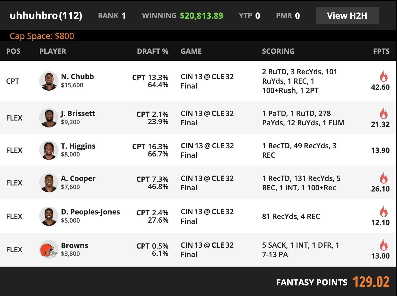| CAPTAIN | Nick Chubb CLE RB | 13.3% | 15600 | 42.6 |