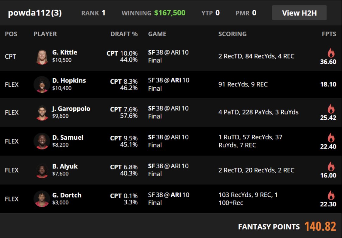 | CAPTAIN | George Kittle SF TE | 10.0% | 10500 | 36.6 |