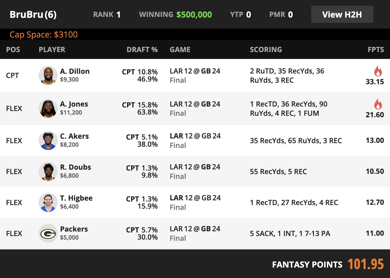 This lineup won by identifying the exact Green Bay rushing concentration the field was not prioritizing in the captain slot. AJ Dillon captain at 10.8 percent ownership was the slate's defining lever. Green Bay scored 24 points, and Dillon captured two rushing touchdowns plus receiving production. That gave the build access to the best multiplier score without paying for the more obvious Aaron Rodgers or Aaron Jones captain paths.
