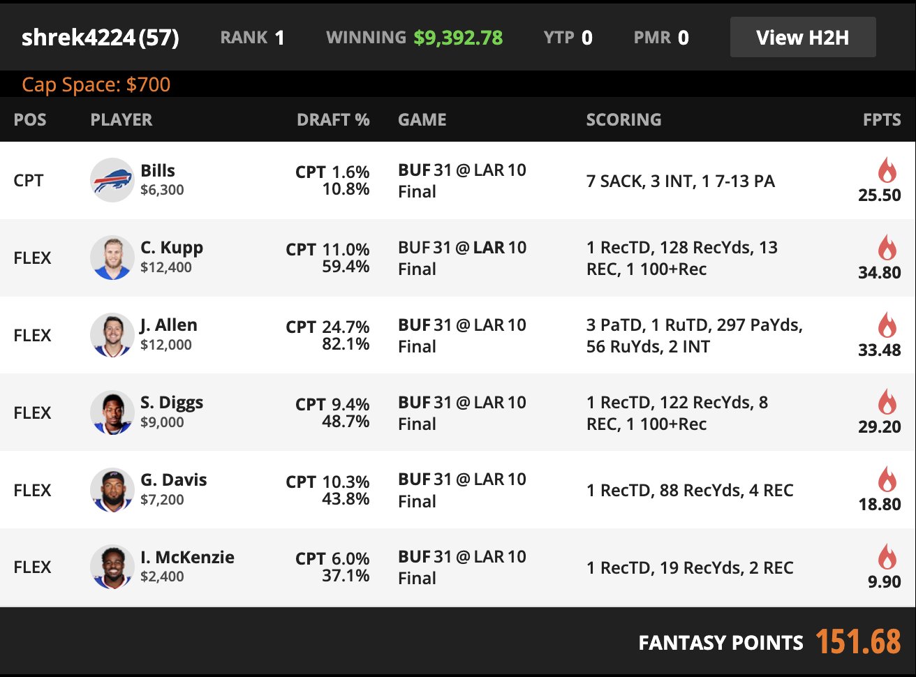 Beyond that, the lineup was far less creative than the finish suggests. Josh Allen, Stefon Diggs, Gabriel Davis, and Cooper Kupp were all highly owned and highly logical. Isaiah McKenzie gave the build needed salary relief, but he was still a usable Buffalo value the field had access to. The roster did leave 700 in salary, which helped, but the overall construction still leaned heavily on popular pieces once the defense captain was in place.