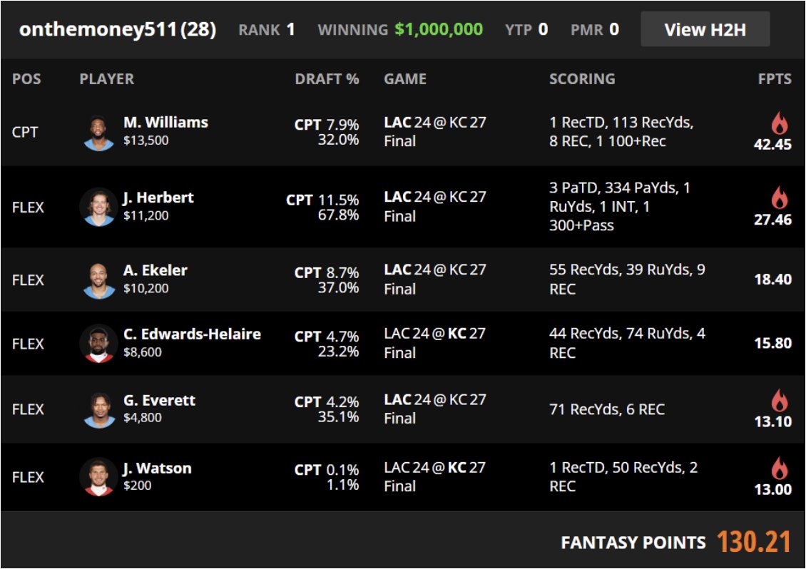 This lineup won because it attacked the game through a narrow but coherent Los Angeles passing concentration while still preserving access to the Kansas City side through the right salary breaking piece. Mike Williams captain at 7.9 percent was the swing point. The field respected him as a flex option, but did not give him enough captain exposure relative to what a downfield, touchdown driven ceiling could do in this environment.