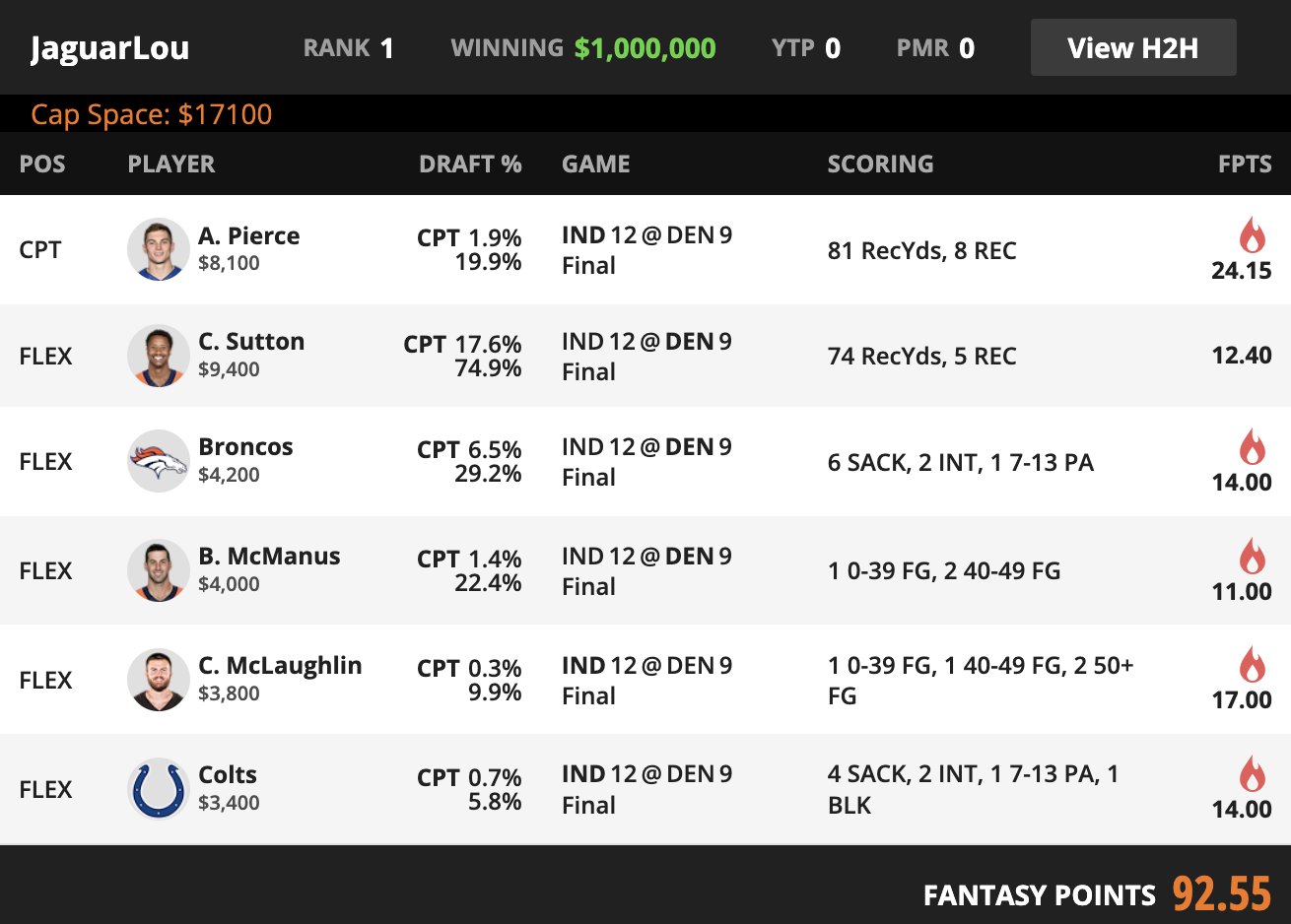 | FLEX | Broncos DEN DST | 29.2% | 4200 | 14 |