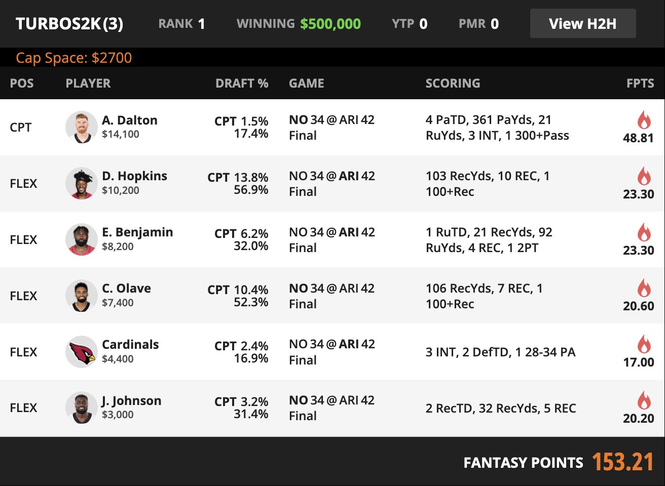 | CAPTAIN | Andy Dalton NO QB | 1.5% | 14100 | 48.81 |