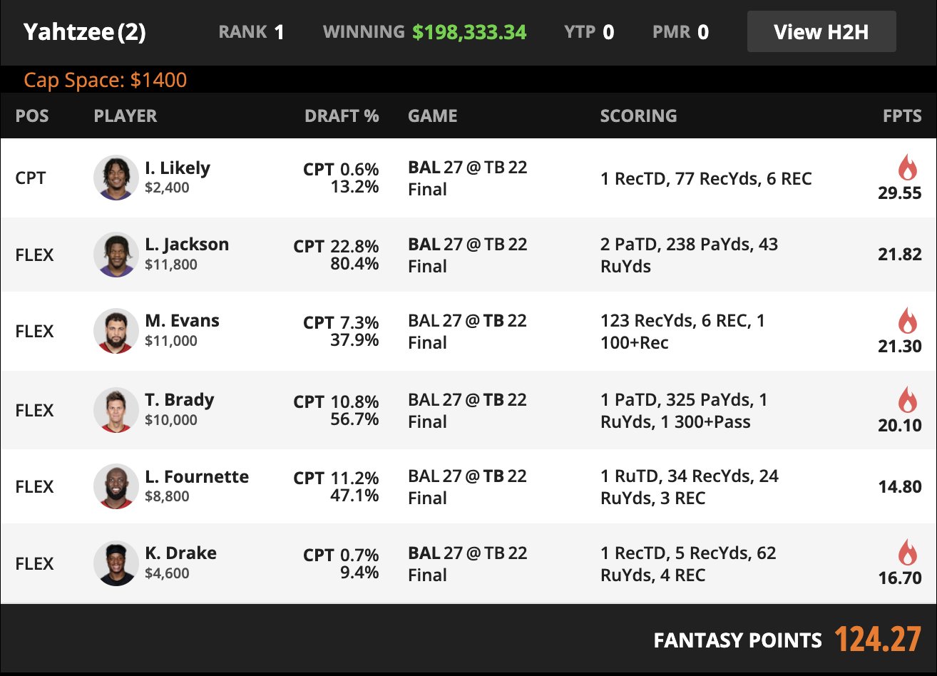 At the same time, the overall ownership shape remained expensive and popular. Lamar Jackson, Tom Brady, Leonard Fournette, and Mike Evans were all common selections. That combination made sense because the game concentrated fantasy production through recognizable volume leaders, but it also raised duplication risk. The split payout confirms that the field was still close enough to this construction once Likely captain landed.