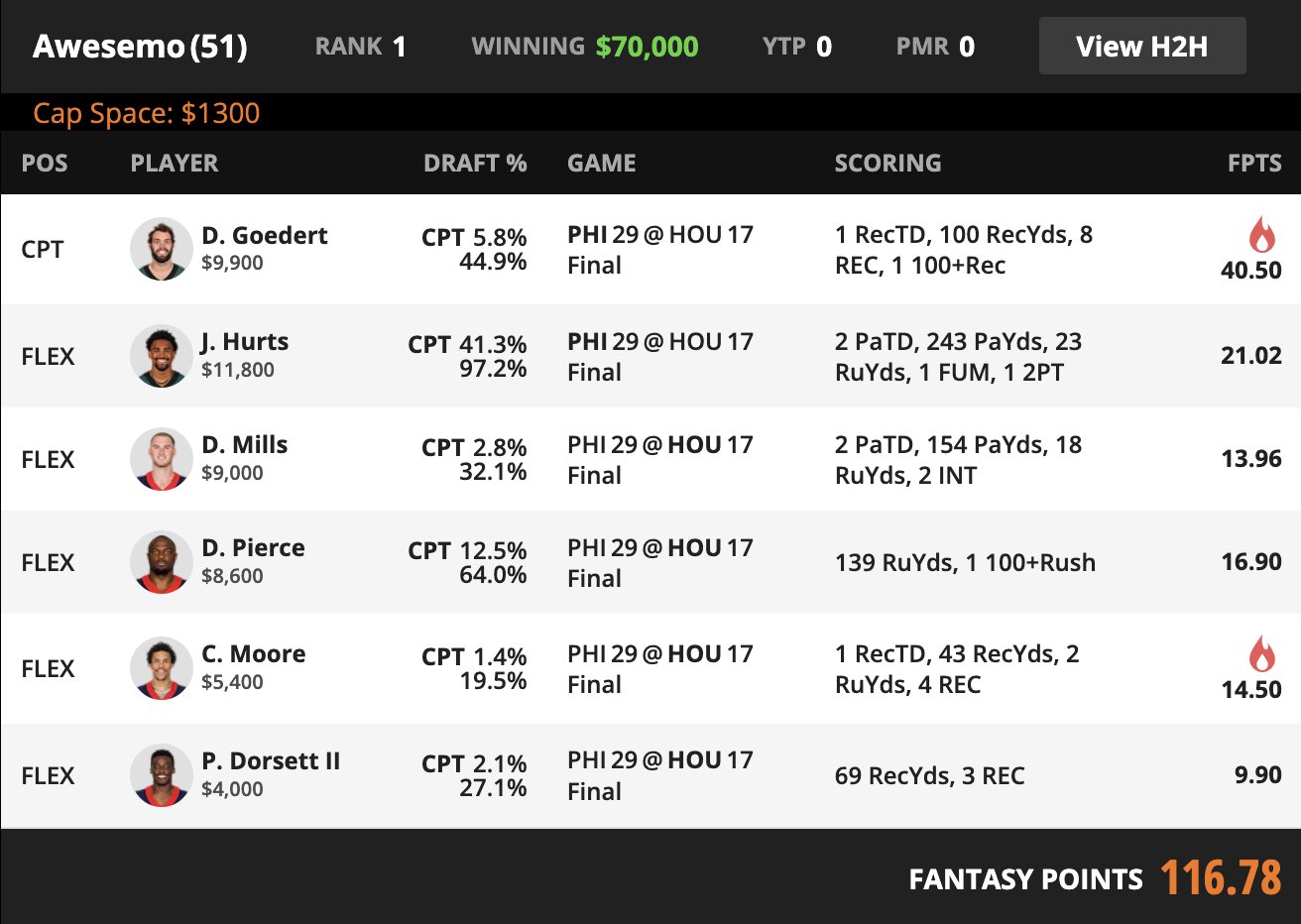 Leaving 1,300 in salary mattered, but it was secondary to the actual structural decision. The sharper call was accepting a Philadelphia captain with a 4-2 style supporting shell around him if the opposing offense stayed concentrated enough. That is what happened. Goedert won the multiplier slot, Hurts remained necessary, and Houston supplied the rest of the usable volume at lower cost.