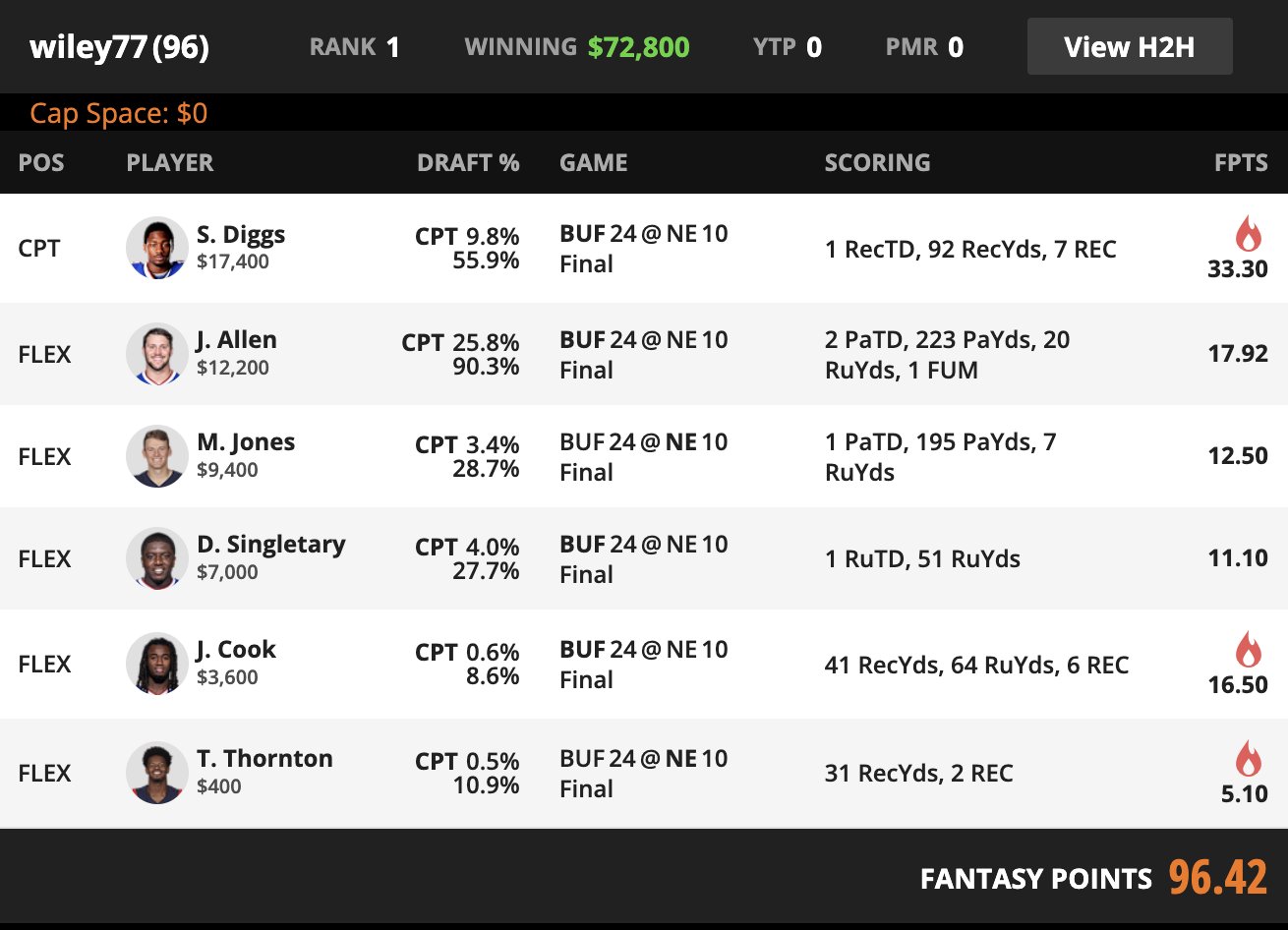 | CAPTAIN | Stefon Diggs BUF WR | 9.8% | 17400 | 33.3 |