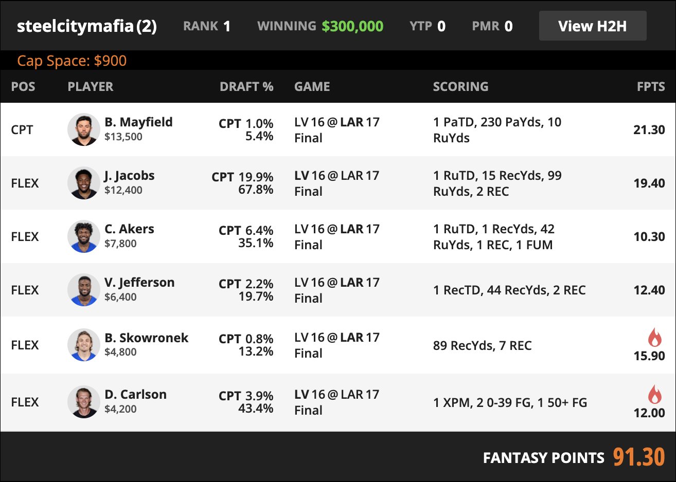 This lineup won because it leaned into the least trusted version of the game and then stayed disciplined around it. Baker Mayfield at 1.0 percent captain ownership was the separator. He had only recently landed with the Rams, so the field had almost no appetite to place him in the multiplier. Once he threw for 230 yards and led the late comeback, the slate turned on a result the field barely built for.