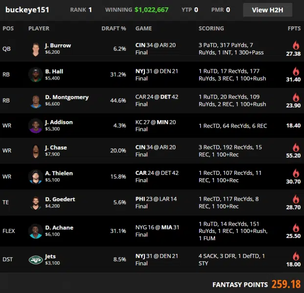 The remaining slots fill the lineup with high volume receivers tied to game scripts that feed targets. Adam Thielen collects PPR through heavy usage, Dallas Goedert reaches a ceiling tight end score, and Jordan Addison supplies a compact touchdown plus reception volume at low ownership. De'Von Achane is popular and productive, so the lineup does not depend on Achane for separation. Achane provides a stable 25 point score while the leverage comes from the Bengals stack and the Jets defense touchdown.