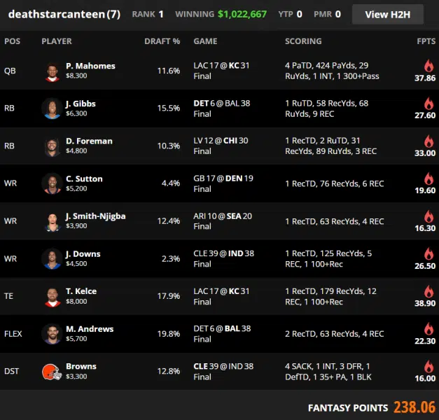 Jahmyr Gibbs adds a different kind of leverage. His role is reception driven and he gets there with nine catches. That matters because it creates a scoring floor while the rest of the build chases spike events. Courtland Sutton and Jaxon Smith Njigba are the minimum viable wide receiver scores. They are not the reason the roster wins. They are the stabilizers that keep the construction intact while the slate breaks open through the three pressure points: Mahomes Kelce, Foreman, and the Browns defense outcome.