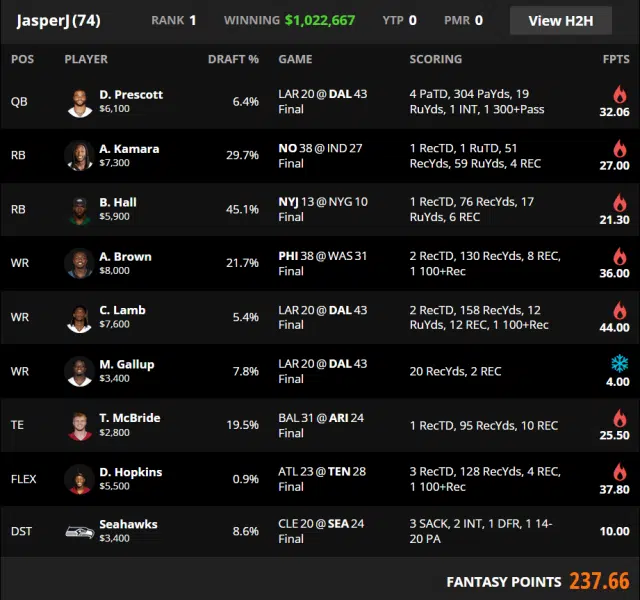 Trey McBride is the second pillar. He is priced as a thin role player and produces ten catches, ninety five yards, and a touchdown. In a week where many lineups tried to treat tight end as a survival slot, this roster treats tight end as a direct path to raw points. Alvin Kamara and Breece Hall handle the volume backbone. Kamara adds both rushing and receiving touchdowns. Hall posts a heavy reception line and still scores. These two plays keep the roster in range of the chalk builds so Hopkins can decide the contest.