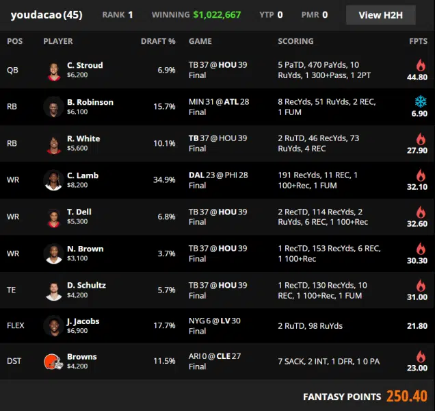 This win is decided by one game turning into a historical outlier, then being captured with maximum density. Five lineup slots come from Tampa Bay at Houston, and every one of them is wired into the same scoring mechanism. C.J. Stroud generates five passing touchdowns, and the roster does not waste those touchdowns on ancillary routes. Tank Dell, Noah Brown, and Dalton Schultz collect the touchdowns and bonus yardage, while Rachaad White provides the opposing scoring so the game never slows. This construction does not need a second game to cooperate. It needs this one game to become the slate.