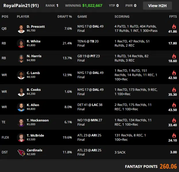 NFL 2023 | Week 10 | Sun, Nov 12, 2023 | DAK TRIPLE, LAMB THREE STRAIGHT OPTIMAL MILLY WEEKS, DOUBLE TE WITH ARI DST STACK