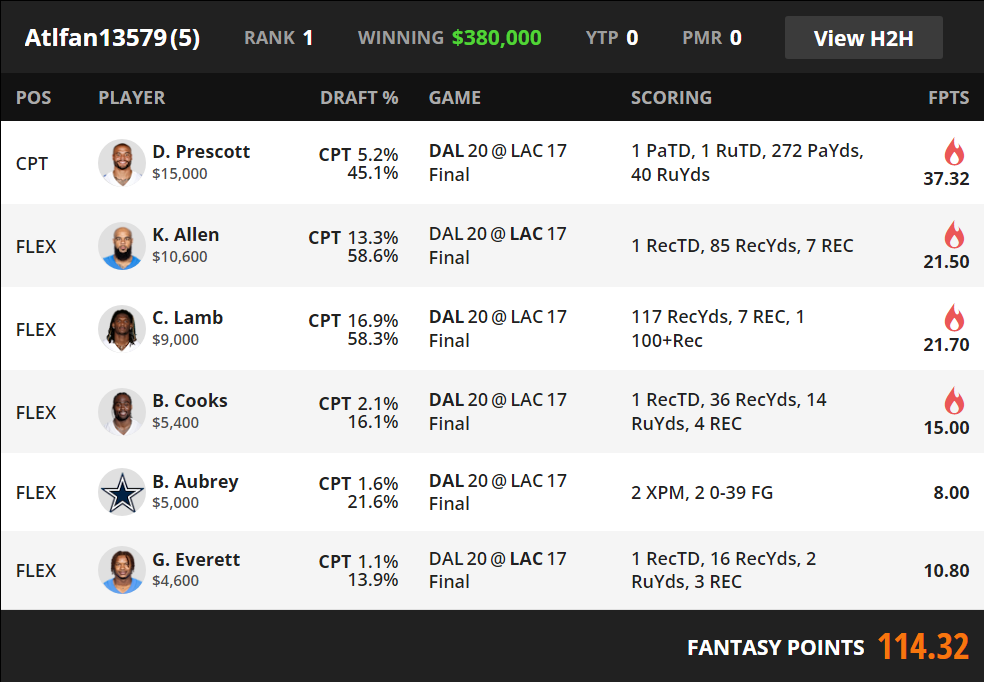 The deeper edge sits in how the build balanced leverage and stability. Prescott captain delivered separation. Keenan Allen and CeeDee Lamb provided high floor volume from both passing games. Brandin Cooks and Gerald Everett were the lower owned pieces carrying direct touchdown equity. This was not a random mixed build. It was a lineup built around the idea that Prescott would outscore the expensive captain alternatives while the game still produced enough pass game concentration for the main skill players to matter.