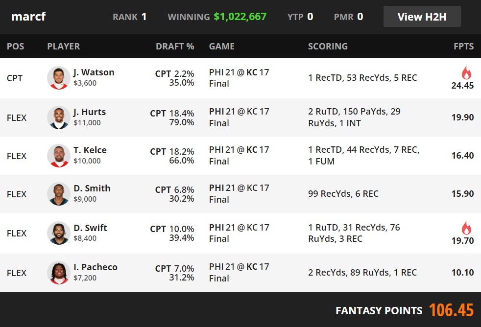 This lineup won by taking the slate’s most explosive leverage point and placing it in the captain slot without compromising access to the game’s core scoring pieces. Justin Watson captain at 2.2 percent was the entire separator. In a game dominated by expensive names and quarterback-centric roster builds, the winning construction shifted the multiplier to a low-salary Kansas City receiver who could still access touchdown equity and enough yardage to break the slate.