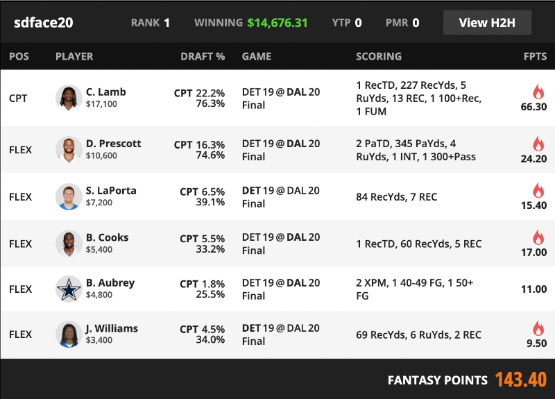 This lineup won by identifying where the slate’s scoring would actually condense and then accepting duplication risk at the top in exchange for overwhelming raw point capture. CeeDee Lamb captain was not a hidden angle. It was the correct ceiling call on a slate where his target share, yardage concentration, and after-catch volume gave him access to a score the rest of the player pool could not match. Once Lamb posted 227 receiving yards and the 100-yard bonus, the captain slot itself became the engine of the tournament.