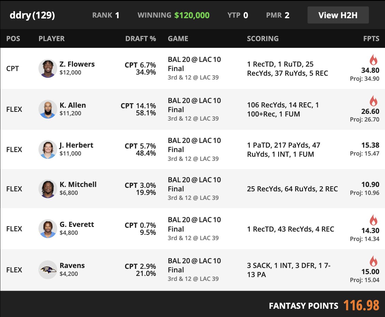 | CAPTAIN | Zay Flowers BAL WR | 6.7% | 12000 | 34.8 |