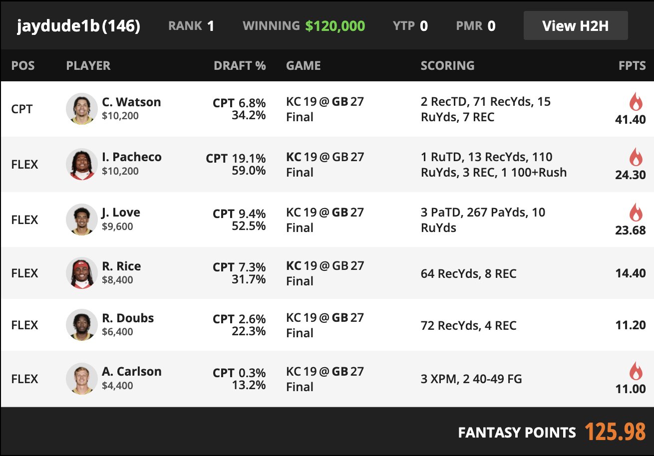 This lineup won by capturing Green Bay's passing concentration through the correct captain while still preserving enough Kansas City volume to keep the game competitive inside the build. Christian Watson captain was the separator. At 6.8 percent captain ownership, the lineup gained access to the slate's most explosive receiving outcome through a player the field did not prioritize enough in the multiplier slot. His score came from two touchdowns plus added rushing yards, which widened the path beyond a standard deep ball only outcome.