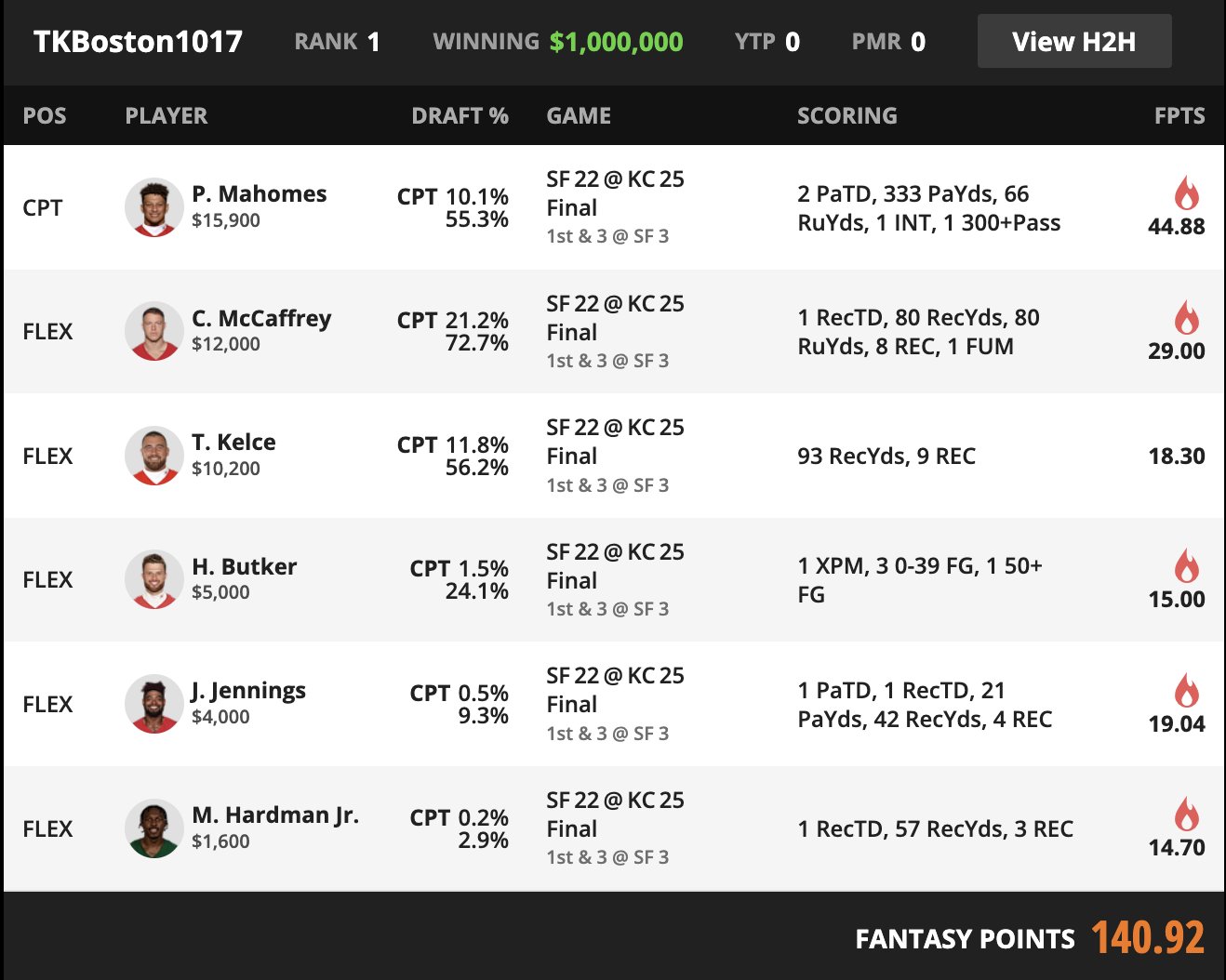The lineup captured the full shape of the game. Mahomes handled the raw quarterback ceiling through passing volume, rushing production, and the 300 yard bonus. Kelce remained attached to Kansas City’s highest value target concentration. Butker collected the stalled drive scoring which often decides championship slates. Christian McCaffrey stayed in because his role was too central to ignore even at major ownership.