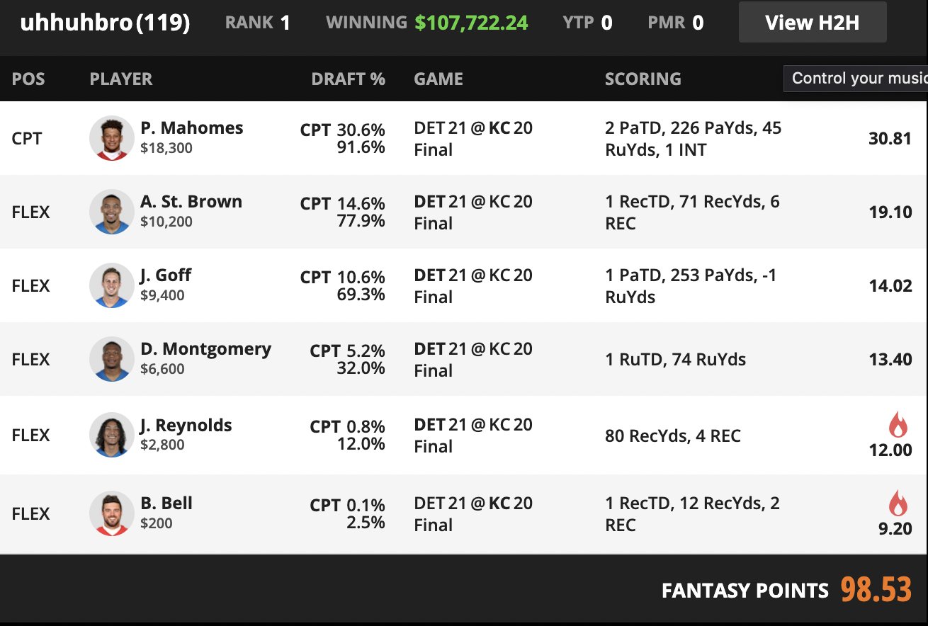 The lineup had two sub 20 percent flex pieces and both mattered for different reasons. Josh Reynolds expanded the Detroit stack without making it too expensive or too common. Blake Bell gave the Chiefs side a thin but live touchdown path that very few Mahomes captain rosters would have prioritized.