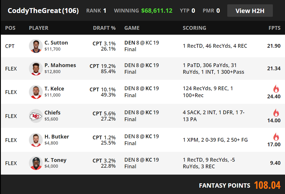 This lineup won because it isolated the only Denver outcome that mattered and then concentrated nearly the entire rest of the roster into Kansas City control. Courtland Sutton captain was the defining choice. At 3.1 percent captain ownership, the lineup captured Denver's lone touchdown through the one Bronco most capable of turning limited team success into a viable multiplier outcome.