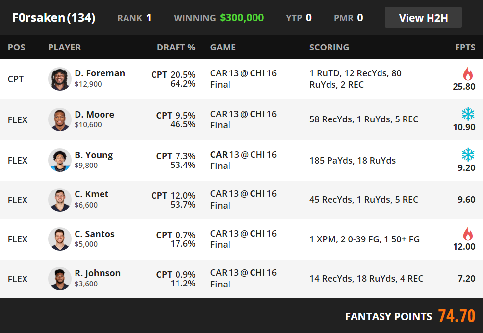 This lineup won because it treated an ugly game as a narrow Chicago control script and then built around the exact fantasy channels that survived inside a 16 to 13 final. D'Onta Foreman captain was the central decision. He was not low owned in absolute terms at 20.5 percent captain ownership, but he was still far less duplicated than the more natural quarterback centered builds on a single game slate. Once Foreman handled 80 rushing yards and the only Chicago touchdown, the captain slot immediately pushed the roster toward the right version of a bad game.