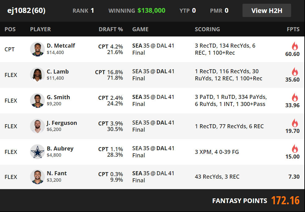 This lineup won because it captured the game through one concentrated Seattle ceiling while still respecting how much Dallas scoring had to remain in the optimal build. DK Metcalf captain was the entire hinge. At 4.2 percent captain ownership, the lineup landed on the one receiver outcome the field did not prioritize nearly enough in the multiplier slot. Once Metcalf reached 134 yards and three touchdowns, the slate stopped being about whether Seattle could keep up and became about whether the rest of the roster could preserve access to Dallas volume without crowding out the Seattle eruption.