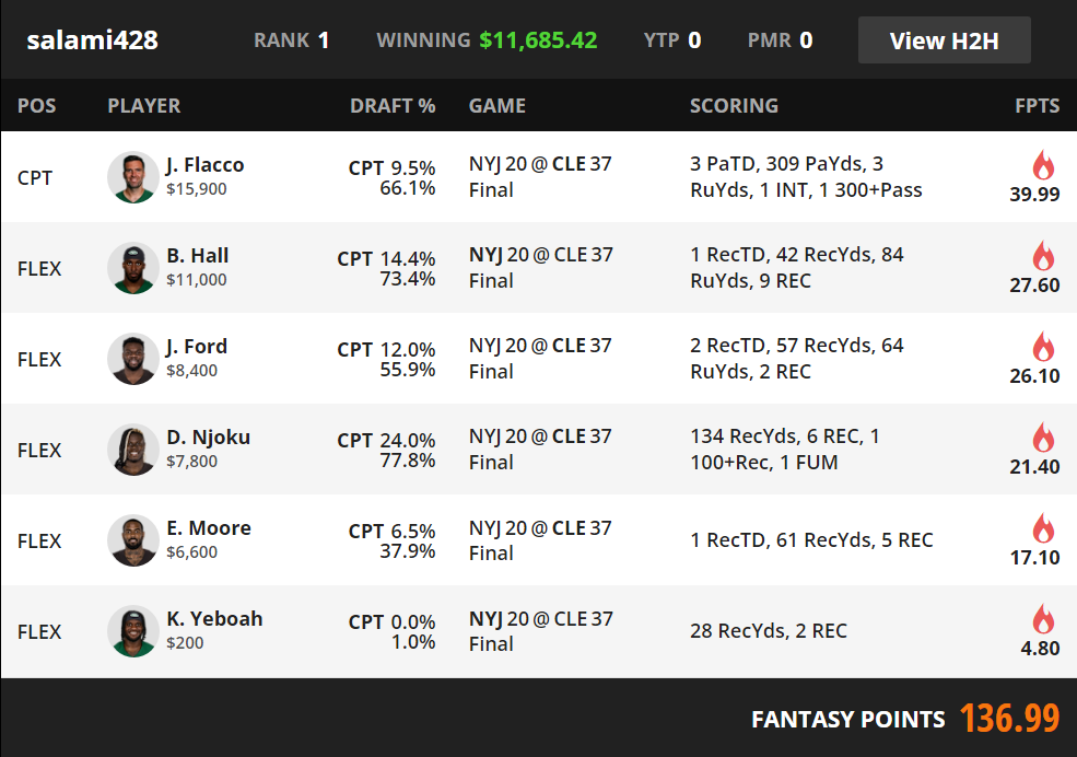 Primary lever: Joe Flacco at 9.5 percent captain ownership gave the lineup a better than average leverage point for a quarterback centered build