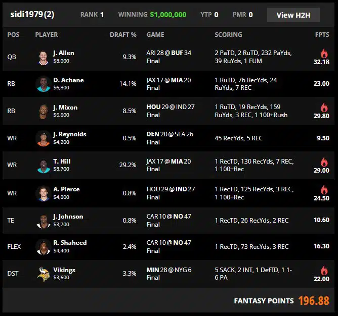 The lineup also avoids a narrow single game dependency. Miami, Houston versus Indianapolis, and New Orleans can each carry the roster with multiple touchdowns, and none of them require a specific quarterback to be perfect. The Vikings defense adds a fourth scoring channel, pressure plus turnover return, against a quarterback who can be baited into negative plays when forced into longer down and distance.