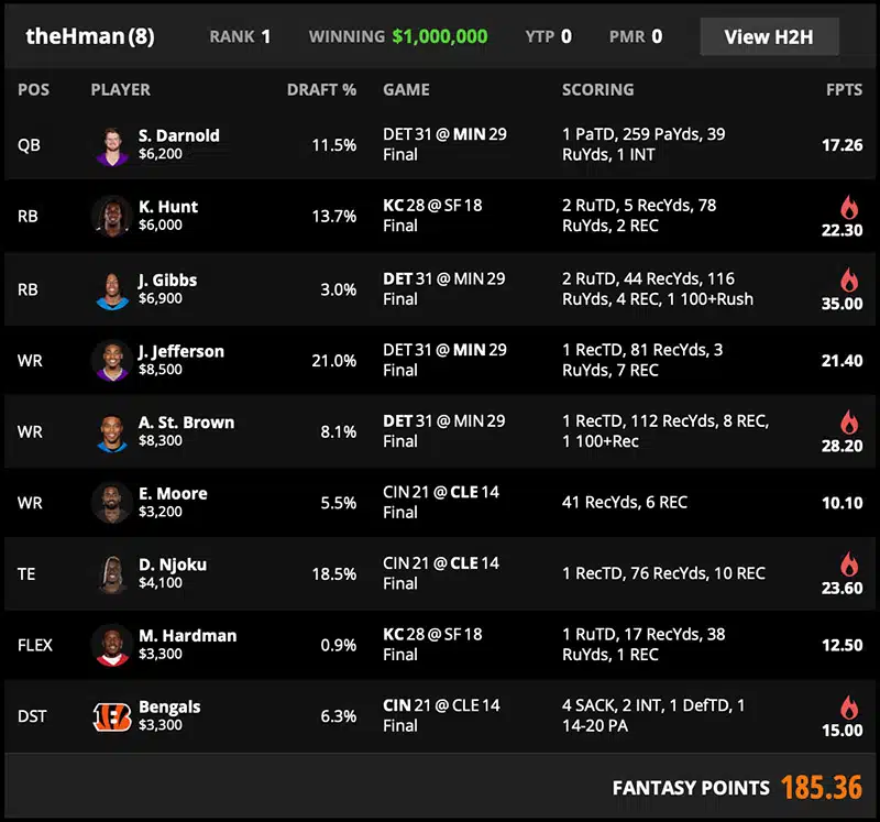 Kansas City at San Francisco is used as a thin but intentional add-on. Kareem Hunt provides touchdown access and a stable rushing base, while Mecole Hardman functions as the true differentiator. At sub-one percent ownership, his rushing touchdown is a small score on paper, but it changes the distribution of who had access to Kansas City points. That is enough in a week where the overall scoring environment compresses and a roster can win without a 200-point threshold.