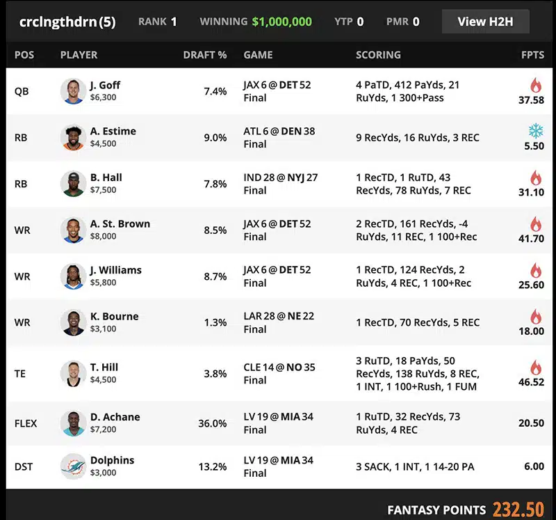 Detroit triple is the obvious element, yet it is not the entire answer. The separator is how the lineup handled the rest of the roster. Many builds that chased Detroit also tried to mirror it with a forced secondary game stack. This roster does not. It isolates Miami as a script pair and treats the other slots as independent touchdown and salary levers.