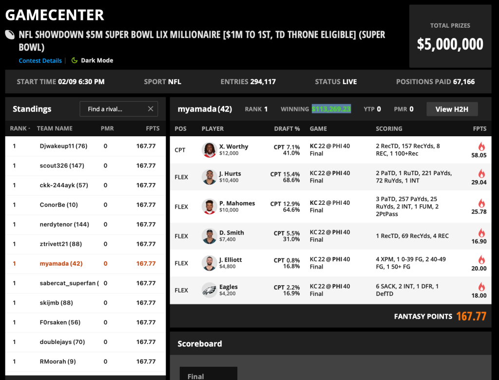 NFL Showdown $5M Super Bowl LIX Millionaire [$1M to 1st, TD Throne Eligible] (Super Bowl) · KC vs PHI