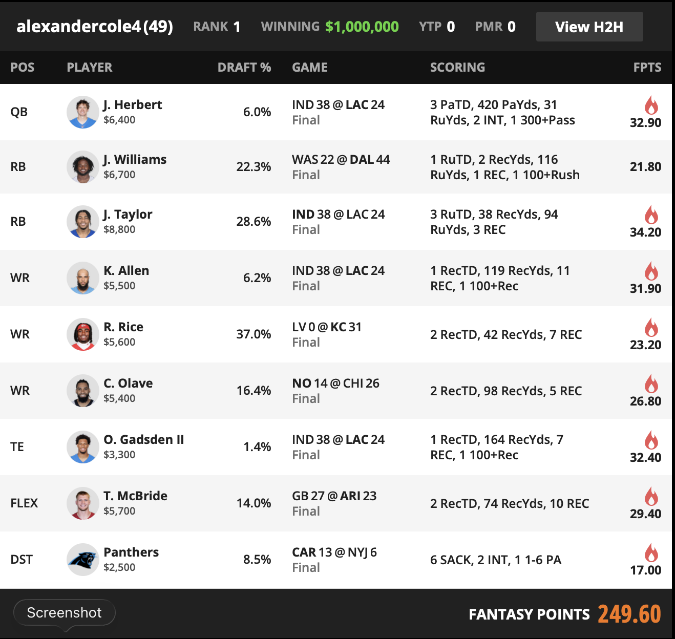 Taylor completes the four player core as the opponent hammer. Three rushing touchdowns is the highest leverage scoring available in a shootout because it absorbs red zone points while still allowing Herbert to reach 420 passing yards. The lineup does not need Colts receivers to cooperate because Taylor captures the touchdowns directly.