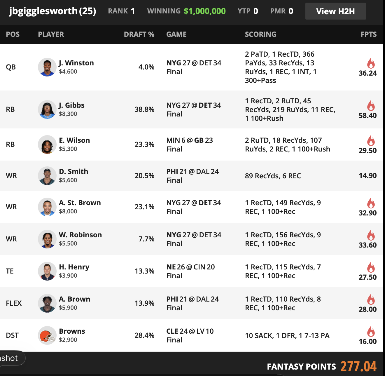This build is a statement about ownership gravity and where to attack it. The slate hands a 38.8 percent Gibbs outcome that becomes an unavoidable scoring anchor, and the lineup refuses to compete with the field by fading it. Instead, it flips the leverage point to quarterback. Winston at four percent produces the version of Detroit at New York scoring where the Lions still erupt, yet the roster captures the back and forth through a cheap quarterback who does not need efficiency to get there. The stat line is chaotic, but the volume creates a ceiling profile very few rosters rostered at quarterback.