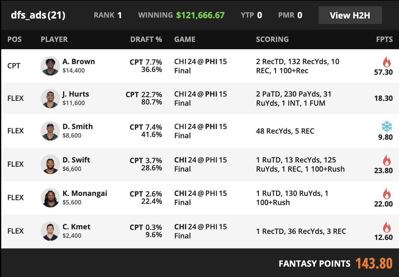 Hurts at 80.7 percent ownership creates heavy overlap, so the lineup has to separate through structure rather than through a full chalk fade. The separation comes from two places. First, Brown captain is the main leverage point because it is a ceiling captain that is still uncomfortable for a lot of entries due to the salary and the fear of spreading touchdowns. Second, the Bears side is built around a double-RB construction.