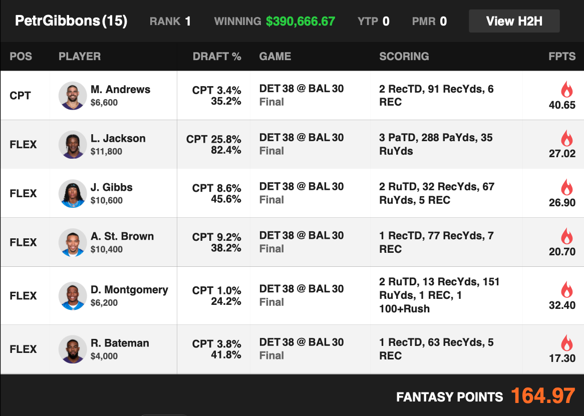 This lineup is a strong reminder that Showdown is often decided by how touchdowns are distributed, not by who scores the most raw points in the flex pool. Detroit put up 38, yet the captain is a Baltimore tight end. The captain decision is a bet on touchdown concentration. Two Andrews scores create a scenario where the Ravens can lose and still produce the top captain outcome because tight end touchdowns are high leverage events on DraftKings.