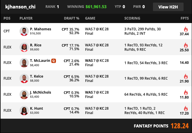 This lineup wins with a chalky center and a contrarian edge in how Washington production gets represented. Mahomes captain plus Rice sits near the field’s default, yet the build stays alive in first because it refuses to pay the tax of a Washington quarterback. Many entries assume a competitive script requires both quarterbacks. This winner takes a narrower stance: Washington generates enough fantasy points through one receiver and one back, while Kansas City accounts for most of the high end outcomes.