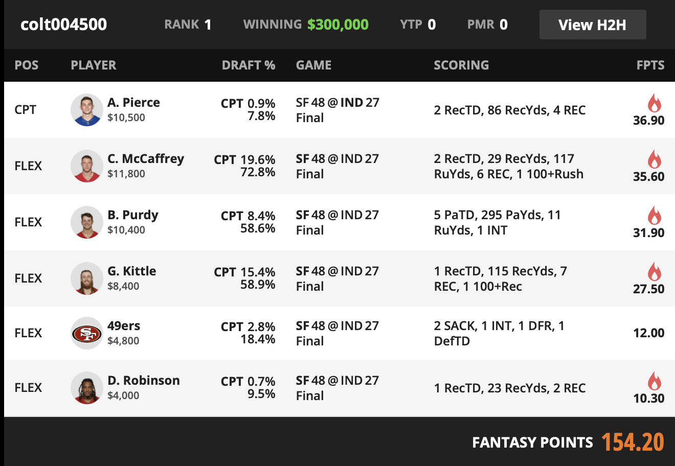 | CAPTAIN | A. Pierce IND WR | 0.9% | 10500 | 36.9 |