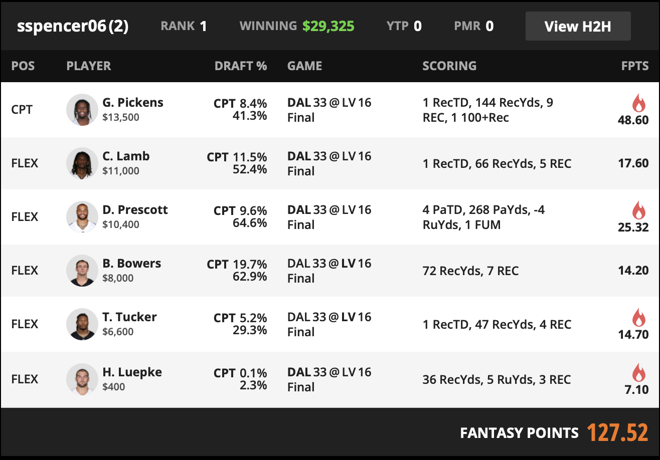 This is a slate where the captain slot carries the win. Pickens captain at modest ownership produces a score high enough to outrun the chalk captain cluster, which forces the rest of the lineup into a simple job: avoid mistakes and stay correlated with the scoring environment.
