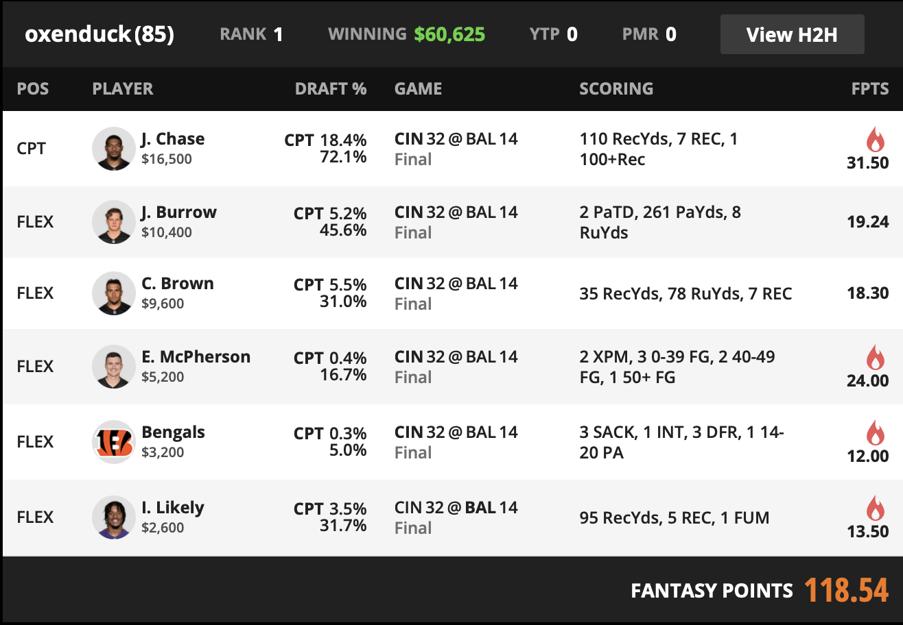This is a Bengals heavy build built for a game where Cincinnati controls the night from start to finish. The captain choice tells the story. Chase posts a slate defining receiving line with the yardage bonus and a touchdown, so the lineup starts by taking the biggest single scoring event and then making sure it does not miss how the rest of the Bengals points were created.