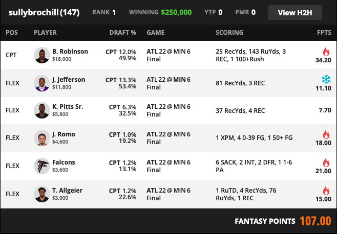 This roster is a full Atlanta control bet. The captain is Bijan because the game stays in a script where his volume never disappears. The second Atlanta running back is there to capture the late game carries that show up once the lead is protected.