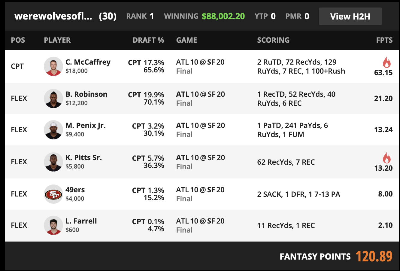 | CAPTAIN | C. McCaffrey SF RB | 17.3% | 18000 | 63.15 |
