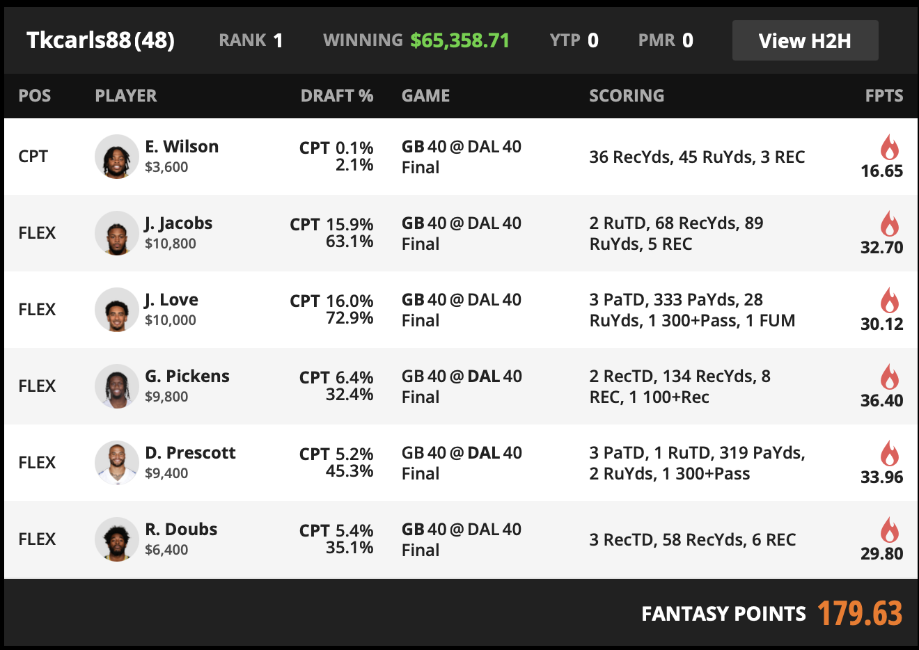 | FLEX | J. Love GB QB | 72.9% | 10000 | 30.12 |