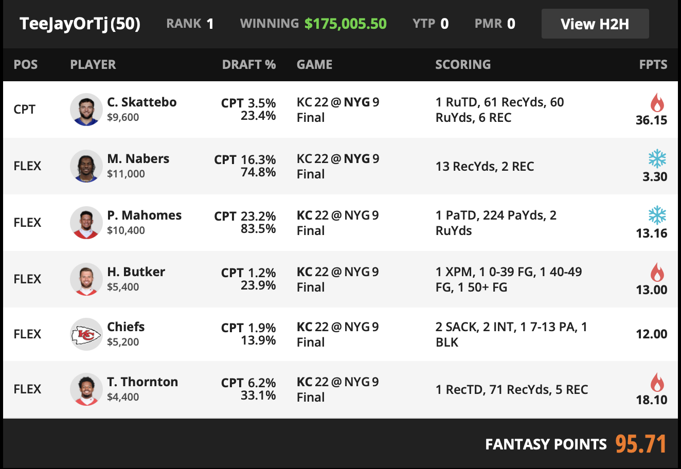 The wild part is Nabers. He is included despite doing nothing because his ownership is massive. This is a roster built to survive a chalk landmine. It accepts the dead spot because Skattebo’s captain score plus the correct Kansas City scoring mix is enough to win first anyway.