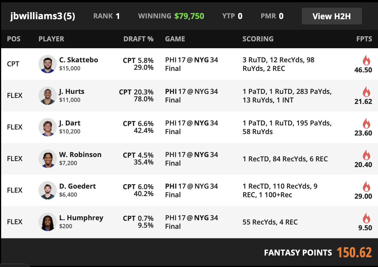 Most entries captain Hurts or a top Eagle. This roster flips captain to the Giants side and still keeps Hurts in flex, so it benefits if Hurts scores enough to stay optimal while New York controls the slate outcome.