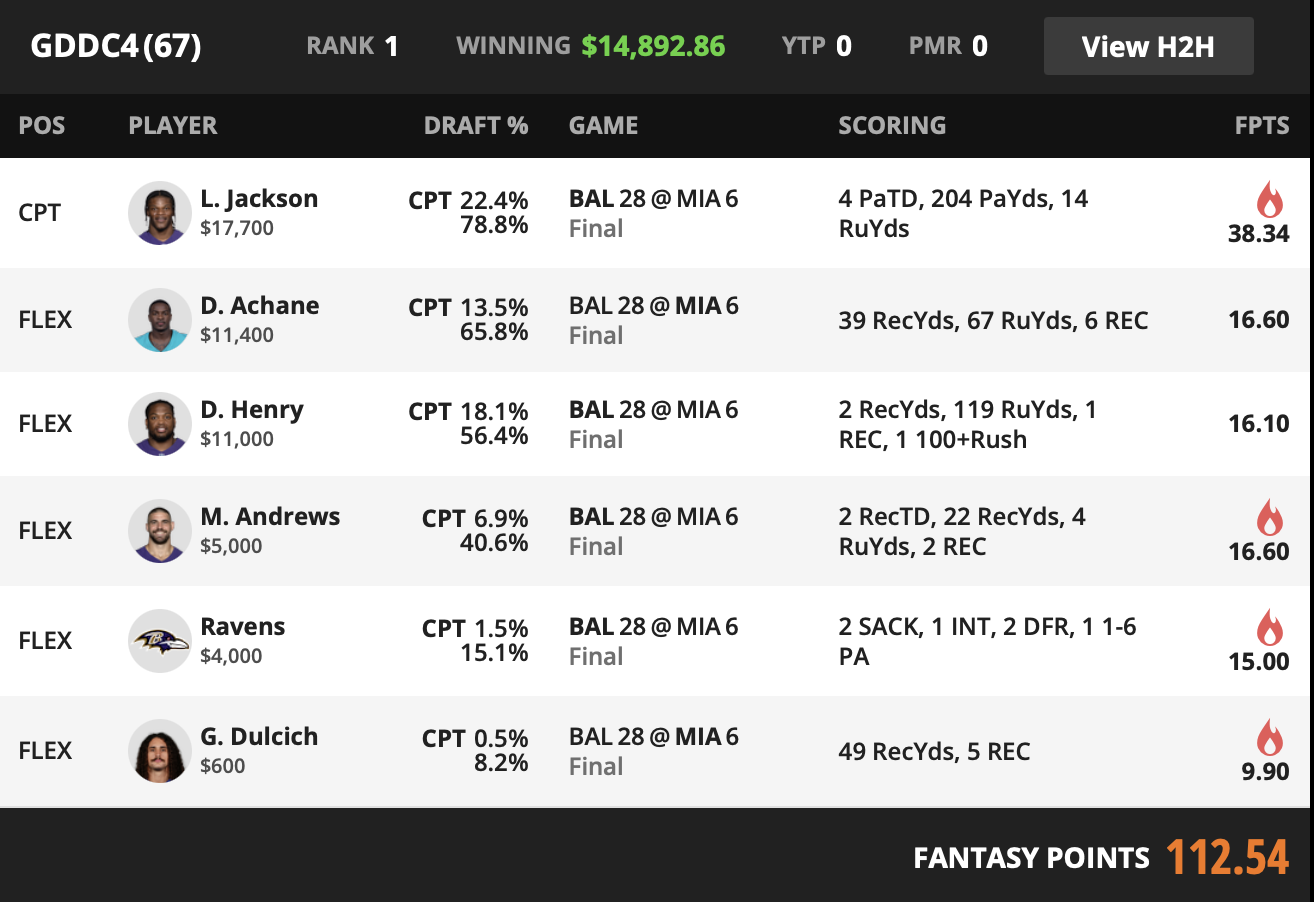 Baltimore is captured through Jackson plus Henry plus Andrews plus the Ravens defense. That combination tells a clear story. Baltimore controlled the game, scored in multiple ways, and the defense added points through pressure and turnovers while Miami struggled. Henry and Andrews do not need ceiling games when the quarterback captain soaks up the touchdowns.