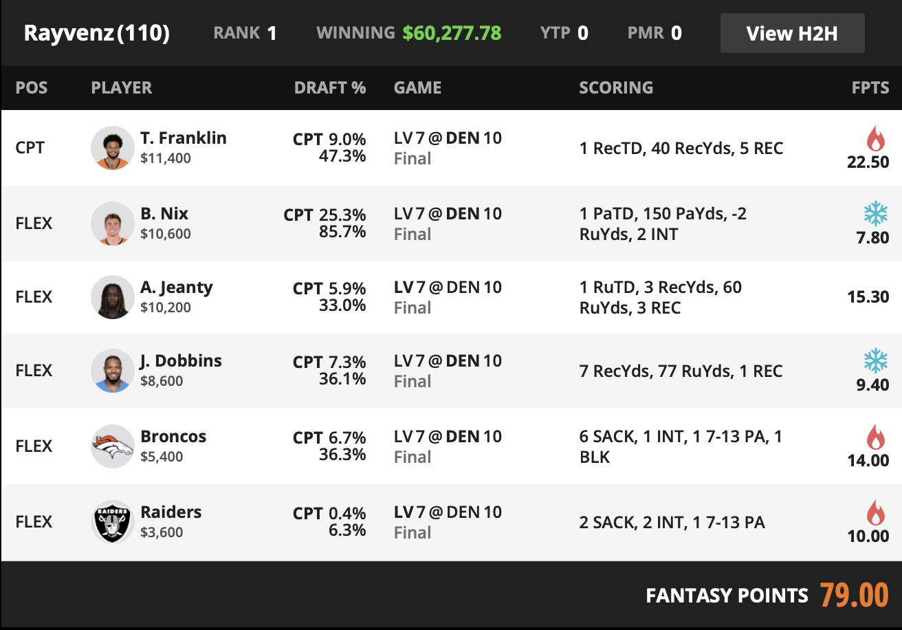 This is also a slate where high ownership does not equal safety. Nix at 85.7 percent flex ownership is the perfect example. The roster survives that because it finds separation through captain and through the second defense slot, where most rosters would force an offensive piece with no path to outscoring a defense.