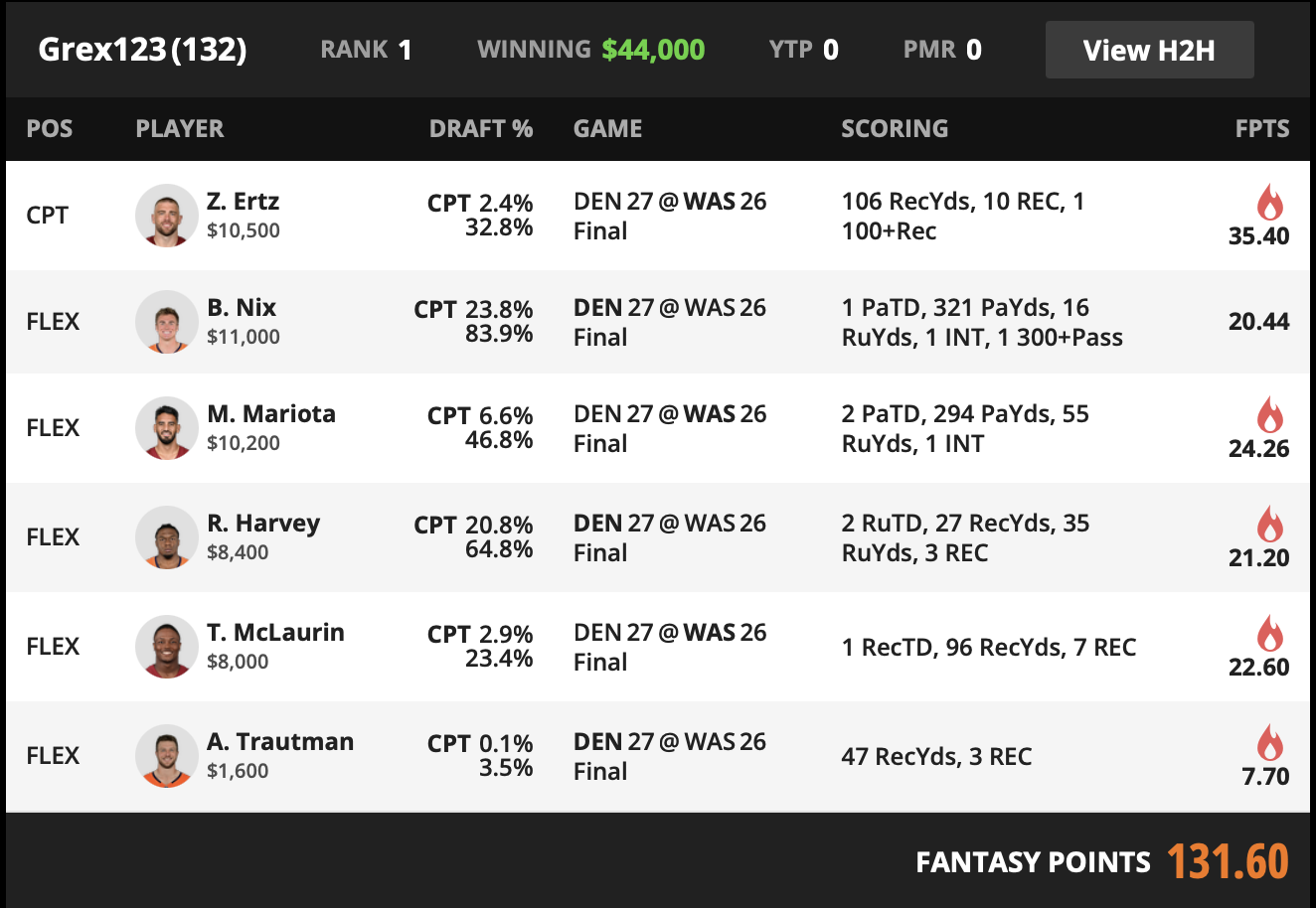 | CAPTAIN | Z. Ertz WAS TE | 2.4% | 10500 | 35.4 |